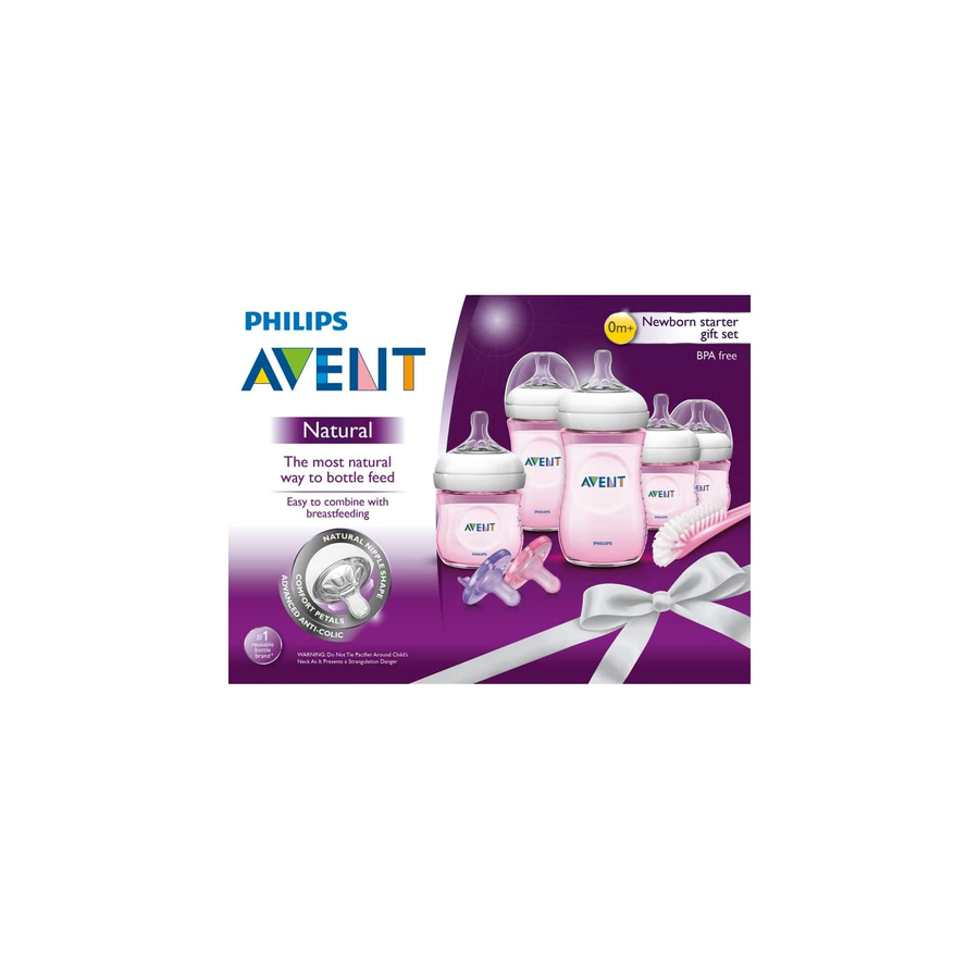 A convenient set that includes four Natural pink bottles (2x 4oz and 2x 9oz), a bottle and nipple brush, and a blue pacifier for babies aged 0-6 months. The redesigned bottle makes bottle feeding more natural, allowing you to combine breast and bottle feeding with ease.