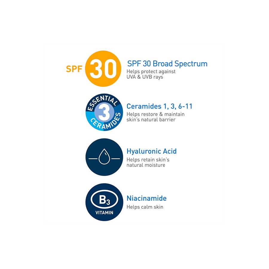 HOMOSALATE (10%), MERADIMATE (5%), OCTINOXATE (5%), OCTOCRYLENE (2%),  ZINC OXIDE  (6.3%). INACTIVE INGREDIENTS: WATER, NIACINAMIDE, GLYCERIN, CETEARYL ALCOHOL, BEHENTRIMONIUM METHOSULFATE, DIMETHICONE, BHT, CERAMIDE NP, CERAMIDE AP, CERAMIDE EOP, CARBOMER, TRIETHOXYCAPRYLYLSILANE, METHYLPARABEN, SODIUM LAUROYL LACTYLATE, CHOLESTEROL, ALUMINUM STARCH OCTENYLSUCCINATE, DISODIUM EDTA, PROPYLPARABEN, HYDROXYETHYLCELLULOSE, HYDROLYZED HYALURONIC ACID, PHYTOSPHINGOSINE, XANTHAN GUM