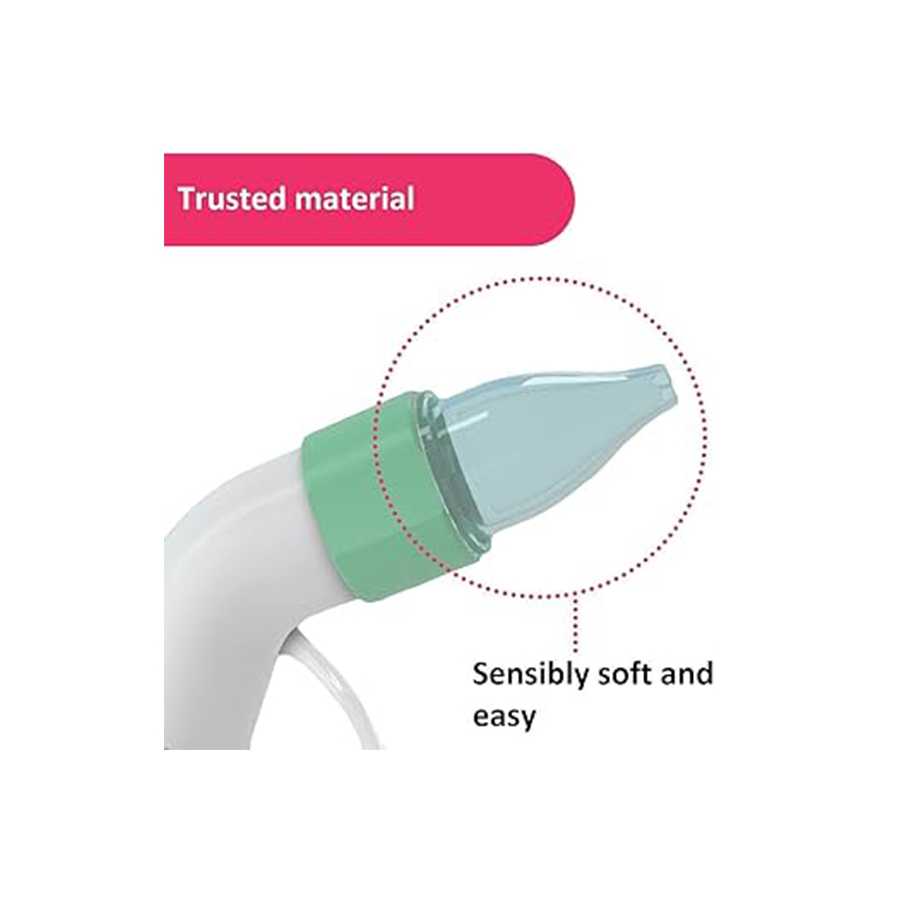 It provides an instant solution to keep the nose clear by removing nasal secretions and enabling the child to breathe normally in its handy resealable packet. Mum is supported while using it thanks to the ergonomic design and non-slip handle. The soft and flexible disposable nozzles are made to fit a baby’s sensitive and fragile nose. To guarantee optimal hygiene, they come with an absorbent filter already installed.