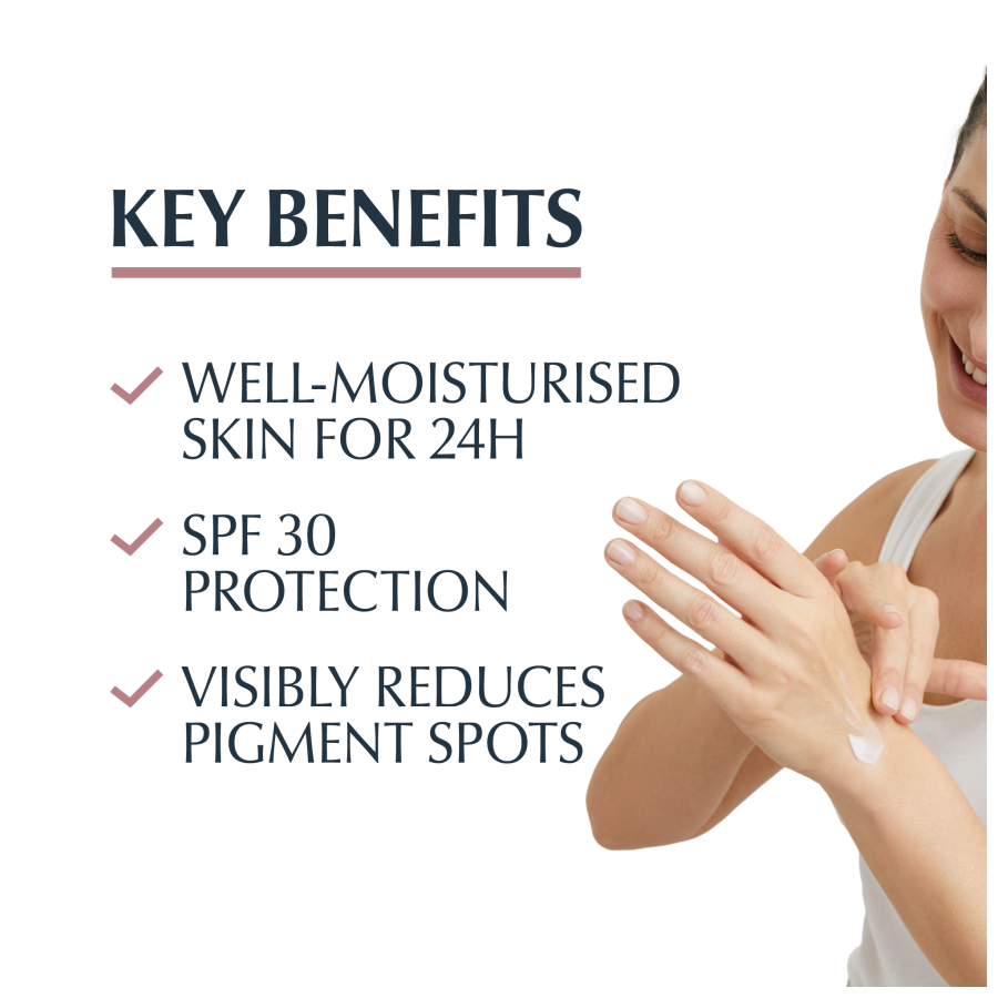 A quickly absorbed anti-pigment correcting hand cream containing patented Thiamidol to reduce the appearance of pigment spots and prevent reappearance with regular usage. Hand cream absorbs quickly and moisturises for 24 hours. SPF 30 provides additional protection from future sun-induced age spots. Maximum four applications per day.