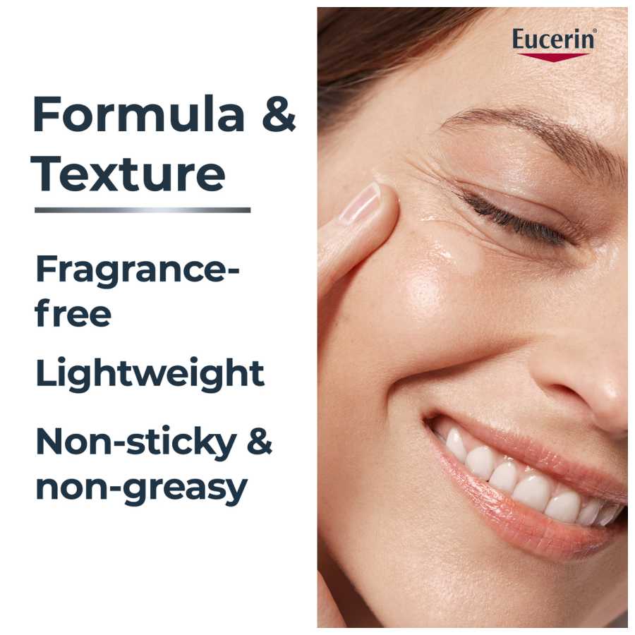 Eucerin Hyaluron-Filler Eye Cream is specially formulated to target “crow’s feet” wrinkles in the delicate eye area. This formula containing a blend of high and low molecular Hyaluronic Acid works on both visible wrinkles and emerging wrinkles, in addition to containing the bioactive Glycine Saponin . SPF 15 and UVA protection work to reduce premature aging and the deepening of wrinkles in the eye area to make skin smoother and younger