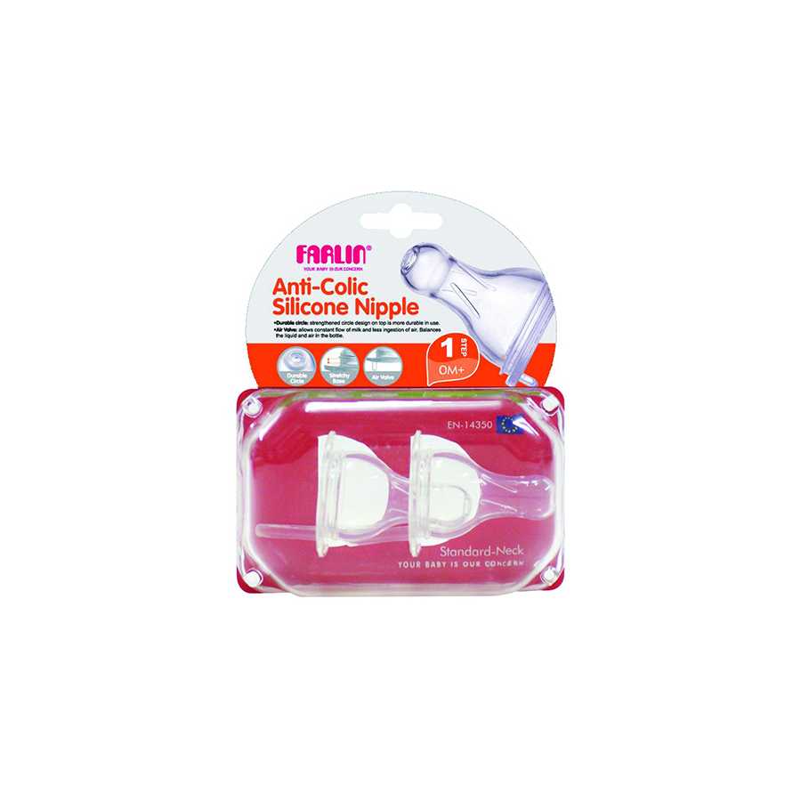 FARLIN SILICONE NIPPLE ANTI COLIC STEP 1, These silicone nipples are specially designed to ensure that the baby is familiar and comfortable with the mother’s nipple shape. They ensure correct placement in baby’s mouth and encourage healthy oral exercise,Lengthened air valve on base allows for constant flow of liquid and less ingestion of air, so prevents colic,Air valve allows constant flow of milk and less ingestion of air balances the liquid and air in the bottle,Stretchy base and durable circle