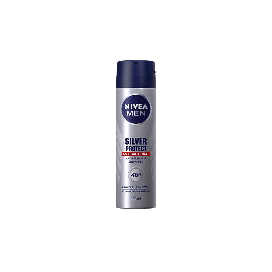 NIVEA SILVER PROTECT MEN 150ML,anti-bacterial protection to give men day-long body odour control. A deodorant for men that battles the bacteria on skin, commonly found in the armpits, from breaking down into acids and multiplying to create body odour.Nivea men silver protect deodorant comes with a unique formula containing anti-bacterial silver ions, which help curb body odour. Unlike other deodorants for men, Day long odour protection with anti-bacterial silver ions. Long lasting freshness, 0% alcohol & Nivea men care complex. Skin tolerance dermatologically proven.
