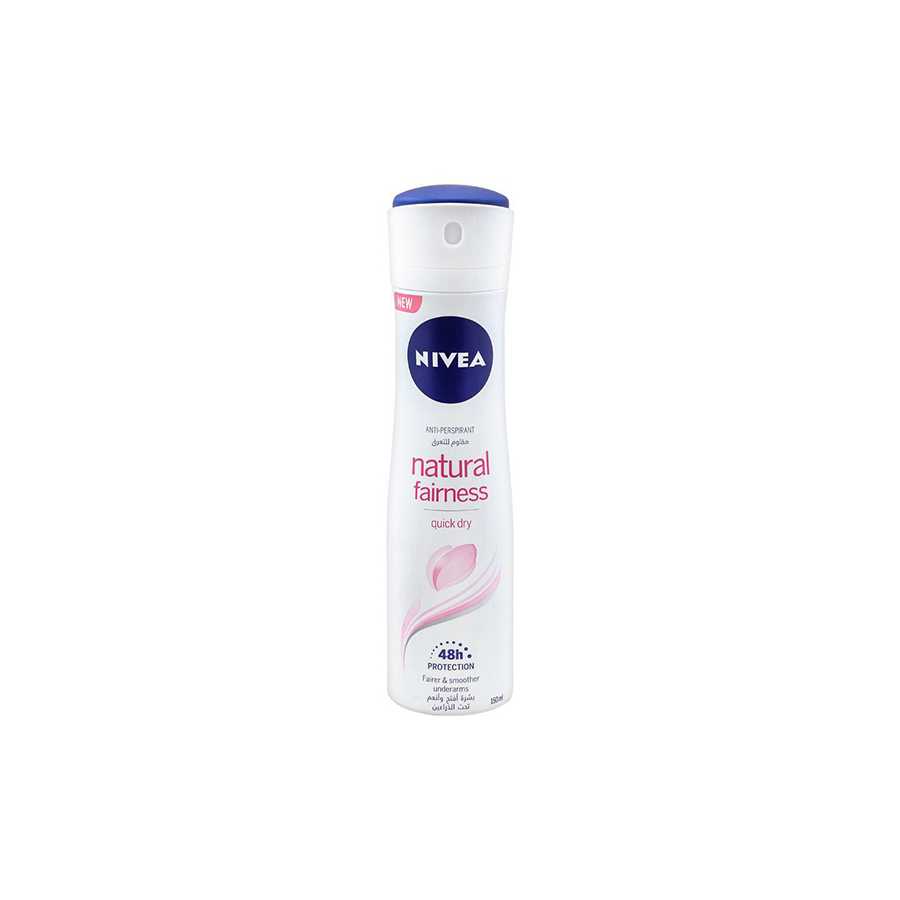 NIVEA NATURAL FAIRNESS SPRAY WOMEN 150ML, Anti-perspirant Deodorant for women is a unique 3-in-1 formula that soothes, protects and enhances your skin’s fairness,A gentle formula with a reliable anti-perspirant protection and infused with vitamin C and avocado extracts, NIVEA Natural Fairness Anti-perspirant Deodorant for women leaves your skin with a long-lasting freshness while keeping away sweat and body odour. Your underarms will feel fairer, smoother and protected for 48hours.