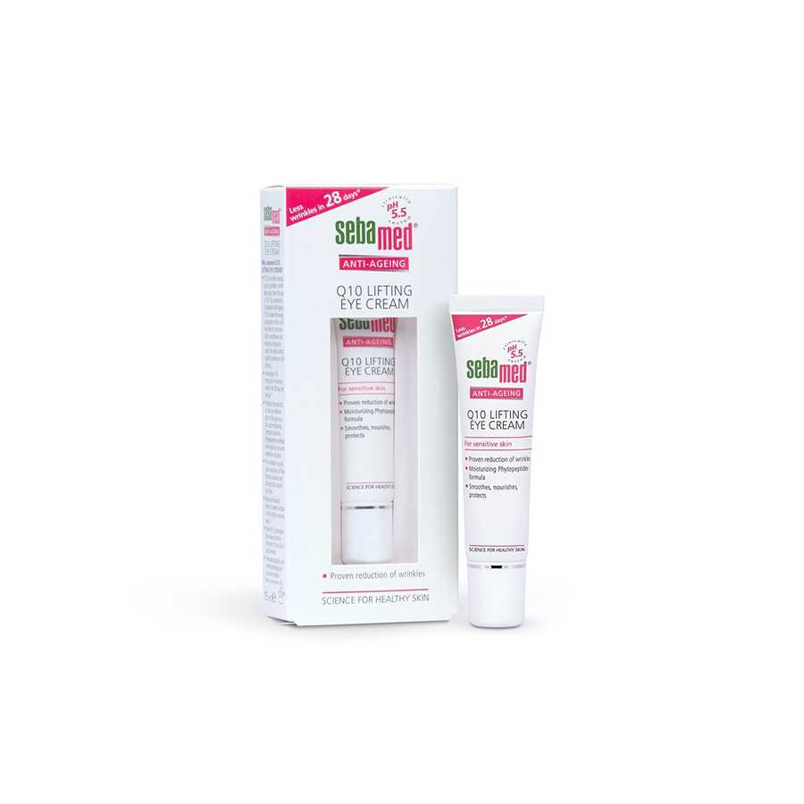 SEBAMED ANTI-AGEING Q10 LIFTING EYE CREAM; specially formulated with a unique formula of vitamins, proteins and natural oils with coenzyme Q10 to help slow the appearance of lines, wrinkles and sensitive skin care around the eye. Q10 LIGTING EYE helps support normal cell growth to improve the vitality of your skin, and it provides an ideal compensation for Q10 deficiency with age, activating the energy production of skin cells and maintaining its smoothness and youthfulness. Rich in a mix of natural oils such as almond oil, shea butter, avocado. as well as a halalornic acid that together form a flexible structure that tightens wrinkles of the sensitive area around the eye and gives it freshness and flexibility. Designed with pH 5.5 which represents the optimum degree of protection for the skin and giving it a natural barrier against pollution and dehydration factors.