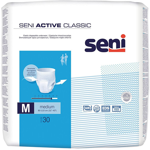 The Seni Active Classic Pants are special breathable incontinence unique trousers for men and women. The outside of the Seni Active Classic Pants products are made from a special, vapor-permeable material and allows the skin to breathe freely and keeps the liquid safely inside the product. The Seni Active Classic Pants have an eds-layer. The special eds-layer ensures quick distribution and absorption of the liquid into the absorbent core and thus ensures a pleasantly dry feeling. A super absorber is used in the trousers, which prevents the formation of unpleasant odors. The Seni Active Classic Pants have no latex elements. Instead, an elastic yarn was used. This minimizes the risk of allergies. Seni products can be used without any concern by people who are allergic to latex. The special shape of the Seni products allows optimal adaptation to the body. This allows the person to enjoy full freedom of movement, comfort and discretion.
