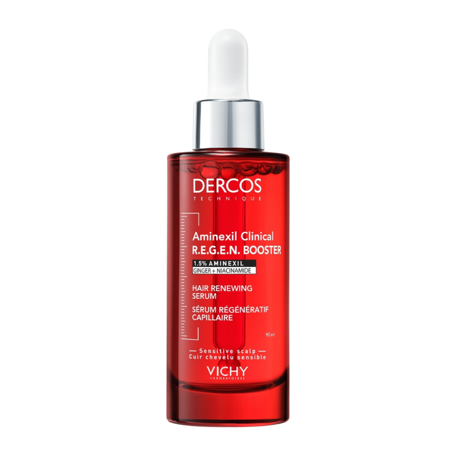 Vichy Dercos Aminexil Clinical R.E.G.E.N. Booster 90 ml is a revitalizing scalp serum formulated to fight hair fall and support hair regrowth. Enriched with 1.5% Aminexil, along with ginger extract and niacinamide, this booster targets thinning hair and weak roots — helping to strengthen hair, reduce shedding, and improve scalp coverage. With regular use, it aims to restore hair’s volume, thickness, and resilience, giving visible improvement over time.