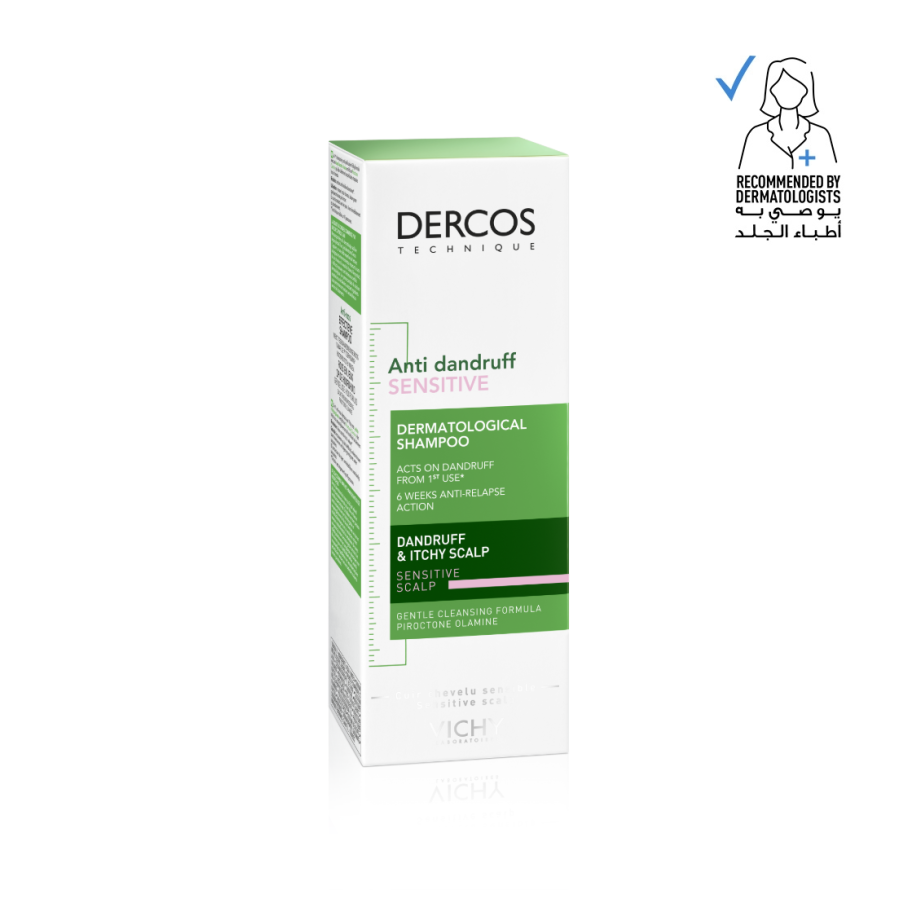 Vichy Dercos Anti-Dandruff shampoo for Sensitive hair. Designed with sulfate-free technology for sensitive scalp that soothes the scalp while acting on eliminating 100% dandruff from first use with 6-week anti-relapse action for long-lasting dandruff control. Suitable for daily use, this lightweight shampoo works to eliminate visible dandruff, providing anti-dandruff protection. Enriched with Selenium DS, the shampoo has an anti-fungal effect, helping to reduce redness and irritation on the scalp by combatting the growth of infection. Also infused with Ceramides, the formula helps to rebuild and strengthen the skin’s natural barriers, working to repair and protect the scalp while locking in moisture. This helps to combat itchiness and irritation, as well as offering antioxidant protection to shield the scalp from harmful environmental aggressors. Finally, Methanol leaves the hair purified and detoxified from root to tip, combatting excess oiliness and sebum production.You’ll be able to enjoy long-lasting comfort throughout the day from wash to wash. The formula is gentle enough to use daily or as often as needed.